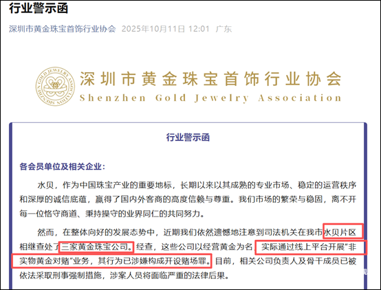 同年10月份,深圳市黄金珠宝首饰行业协会曾发布行业警示函。该函显示,司法机关在水贝片区相继查处了三家黄金珠宝公司。