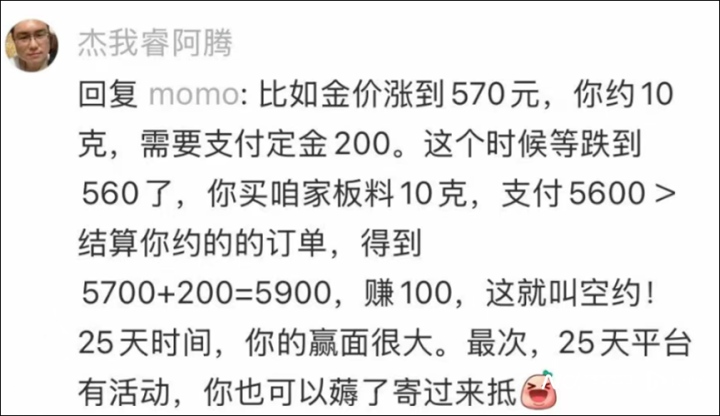锁价交易则是消费者缴纳定金后,可以锁定当前贵金属价格,并约定一个期限后交易。期限到时,用户可以选择不提取实物,让平台按锁定价格回购,这样在黄金价格下跌时,可以赚取差价。